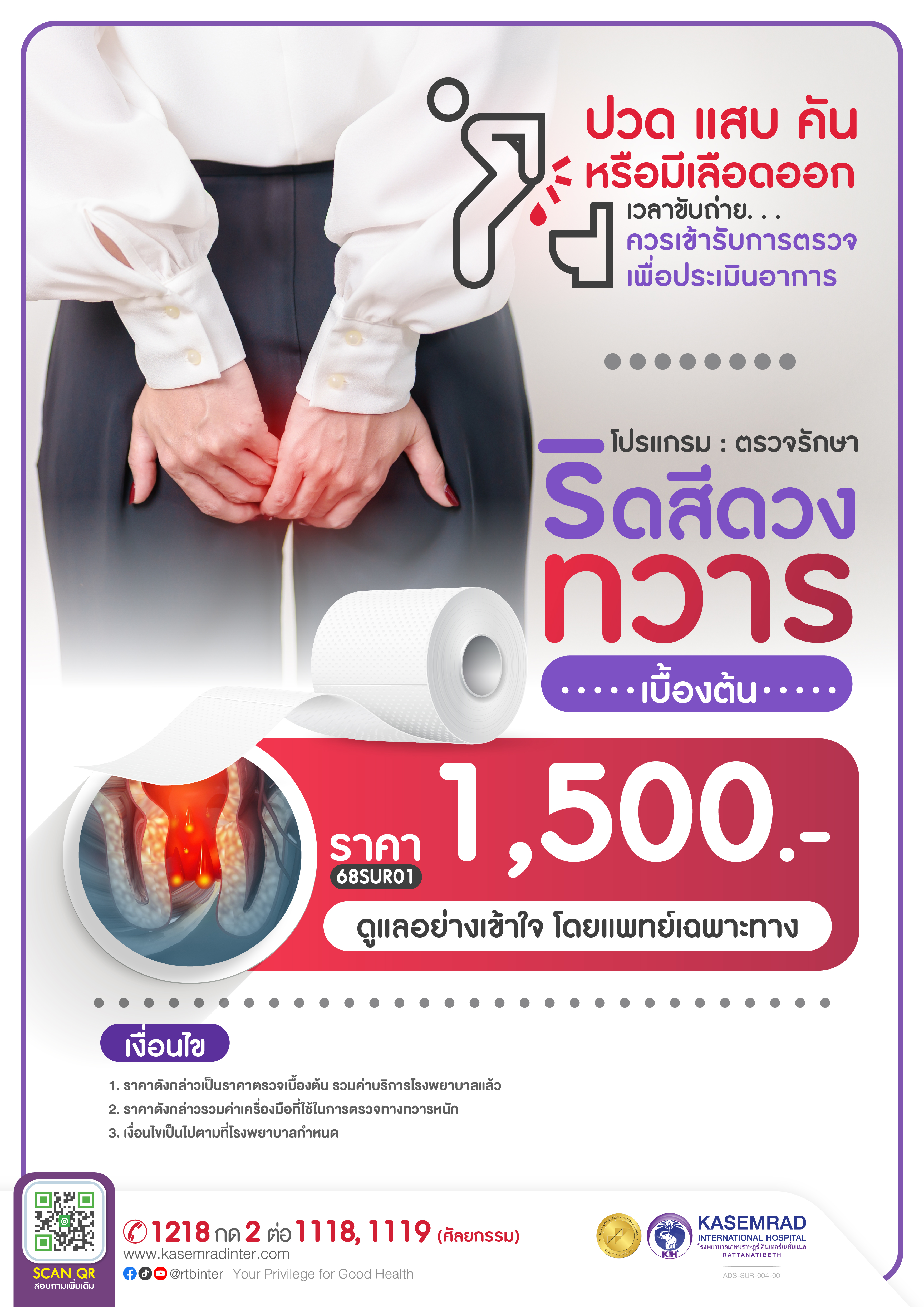 โปรแกรมตรวจรักษาริดสีดวงทวาร (เบื้องต้น) ราคา 1,500 บาท ดูแลอย่างเข้าใจ โดยแพทย์เฉพาะทาง