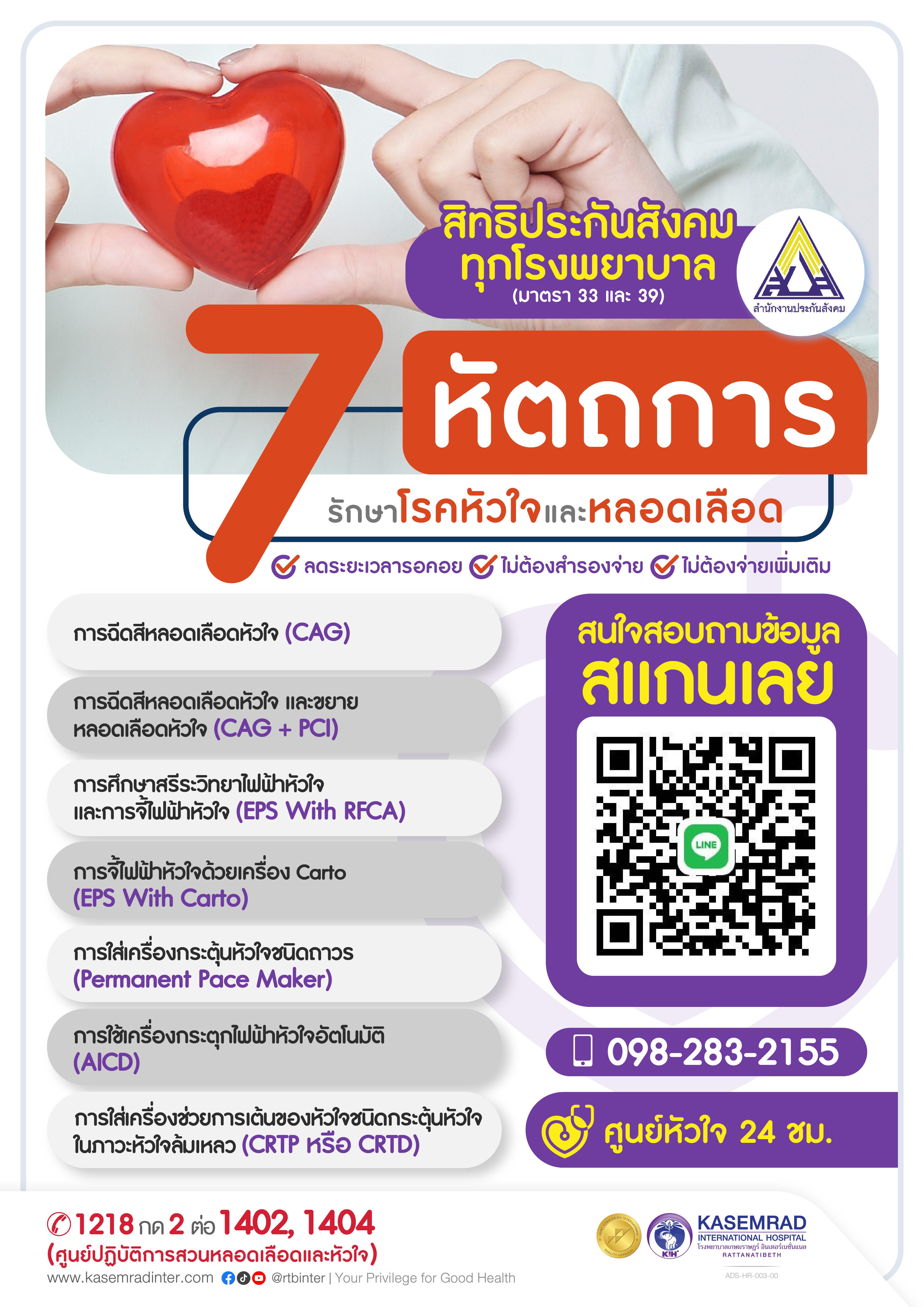 สิทธิประกันสังคมทุกโรงพยาบาล (มาตรา 33 และ 39) รักษาโรคหัวใจและหลอดเลือด 7 หัตถการ